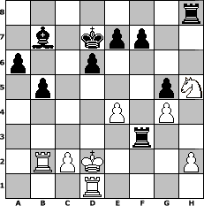 Partie-Notation im PGN-Format [Event "Der sizillianische Drachen"] [Site "www.mySchach.de"] [Date "2004.06.23"] [Round "1"] [White "Joschi"] [Black "myfairlady"] [ECO "B70"] [WhitemyELO "1600"] [BlackmyELO "1780"] [Result "0-1"] [TimeControl "10/3456000"] [WhiteDays "160"] [BlackDays "160"] [MySchachNr "5331"] 1. e4 c5 2. Nf3 d6 3. d4 cxd4 4. Nxd4 Nf6 5. Nc3 g6 6. Be2 a6 7. O-O Bg7 8. Be3 Nbd7 9. Nb3 b5 10. f3 Bb7 11. a3 Rc8 12. Qd2 O-O 13. Bh6 Ne5 14. Bxg7 Kxg7 15. Rad1 Qb6+ 16. Qd4 Qxd4+ 17. Nxd4 Nc4 18. Bxc4 Rxc4 19. Nde2 Rfc8 20. Rd3 Nd7 21. Rfd1 Ne5 22. R3d2 R4c7 23. Rb1 h5 24. Kf1 Kf8 25. Kf2 Ke8 26. Rdd1 Kd7 27. Ke3 g5 28. Ng3 Nc4+ 29. Kd3 Nxb2+ 30. Rxb2 Rxc3+ 31. Kd2 Rxa3 32. Nxh5 Rh8 33. g4 Rxf3 0-1 Stellungs-Notation im FEN-Format 7r/1b1kpp2/p2p4/1p4pN/4P1P1/5r2/1RPK3P/3R4 - - - 0 34 Geschlagene Figuren Weiss: Geschlagene Figuren Schwarz: Klicken Sie auf eine geschlagene Figur um den gewünschten Zug darzustellen!