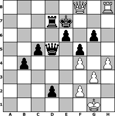 Partie-Notation im PGN-Format [Event "Schach dem Osterhasen IV"] [Site "www.mySchach.de"] [Date "2015.03.29"] [Round "1"] [White "Achimkogge"] [Black "Caligula"] [ECO "D02"] [WhitemyELO "1494"] [BlackmyELO "1385"] [Result "1-0"] [TimeControl "10/2592000"] [WhiteDays "138"] [BlackDays "126"] [MySchachNr "98741"] 1. d4 d5 2. Nf3 Nf6 3. c3 e6 4. Bf4 Nbd7 5. e3 c5 6. Bb5 a6 7. Qa4 Be7 8. Ne5 O-O 9. dxc5 Nxc5 10. Qd4 axb5 11. b4 Nh5 12. bxc5 Nxf4 13. exf4 f6 14. Nf3 Qc7 15. O-O Bxc5 16. Qd3 Bd7 17. g3 Bc6 18. Nbd2 Bd7 19. Nb3 f5 20. Nxc5 Qxc5 21. Ne5 Be8 22. a3 Rxa3 23. Rxa3 Qxa3 24. Qc2 Qc5 25. Ra1 Bc6 26. Nxc6 bxc6 27. Qd3 Rd8 28. Ra5 Kf8 29. Kg2 d4 30. c4 g6 31. h4 Qxc4 32. Qa3+ Ke8 33. Ra7 Qd5+ 34. Kg1 c5 35. Rxh7 b4 36. Qa4+ Rd7 37. Rh8+ Ke7 38. Rh7+ Ke8 39. Rh8+ Ke7 40. Qb5 d3 41. Qb8 d2 42. Qf8# 1-0 Stellungs-Notation im FEN-Format 5Q1R/3rk3/4p1p1/2pq1p2/1p3P1P/6P1/3p1P2/6K1 - - - 1 42 Geschlagene Figuren Weiss: Geschlagene Figuren Schwarz: Klicken Sie auf eine geschlagene Figur um den gewünschten Zug darzustellen!