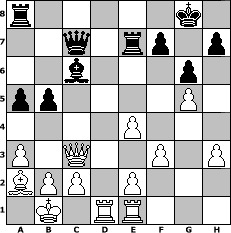 Partie-Notation im PGN-Format [Event "#7"] [Site "www.mySchach.de"] [Date "2015.01.24"] [Round "1"] [White "Winston"] [Black "Knight"] [ECO "C44"] [WhitemyELO "1523"] [BlackmyELO "1299"] [Result "1-0"] [TimeControl "10/1728000"] [WhiteDays "20"] [BlackDays "20"] [MySchachNr "97823"] 1. e4 e5 2. Nf3 Nc6 3. a3 Nf6 4. Nc3 d6 5. h3 Be7 6. Bc4 O-O 7. d4 exd4 8. Nxd4 Ne5 9. Ba2 Re8 10. Be3 c5 11. Nf3 Nxf3+ 12. Qxf3 Bf8 13. O-O-O g6 14. Kb1 Bg7 15. Bxc5 Bf8 16. Rhe1 Qc7 17. Be3 Bd7 18. Bf4 Bc6 19. Bxd6 Bxd6 20. Qxf6 Be5 21. Qf3 Bxc3 22. Qxc3 Re7 23. f3 a5 24. g4 b5 25. g5 1-0 Stellungs-Notation im FEN-Format r5k1/2q1rp1p/2b3p1/pp4P1/4P3/P1Q2P1P/BPP1P3/1K1RR3 - - - 0 25 Geschlagene Figuren Weiss: Geschlagene Figuren Schwarz: Klicken Sie auf eine geschlagene Figur um den gewünschten Zug darzustellen!