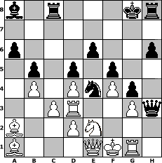 Partie-Notation im PGN-Format [Event "Jahresende"] [Site "www.mySchach.de"] [Date "2012.12.04"] [Round "1"] [White "Knight"] [Black "lotchi"] [Variant "Fischerrandom"] [SetUp "1"] [FEN "bbrnqknr/pppppppp/8/8/8/8/PPPPPPPP/BBRNQKNR w KQkq - 0 1"] [WhitemyELO "1182"] [BlackmyELO "1287"] [Result "1/2-1/2"] [TimeControl "10/864000"] [WhiteDays "10"] [BlackDays "02"] [MySchachNr "85286"] 1. d4 d5 2. Nf3 Nf6 3. Nc3 c6 4. e4 Bf4 5. Rd1 e6 6. g3 Bd6 7. e5 Bxe5 8. Nxe5 b5 9. a3 a6 10. b4 h6 11. f4 Qe7 12. h4 Nd7 13. Nxd7+ Qxd7 14. h5 f5 15. a4 Nf7 16. axb5 cxb5 17. Ne2 Kg8 18. c3 Nd6 19. Rg1 Ne4 20. Nc1 Qf7 21. Rd3 Qxh5 22. Ba2 g5 23. Ne2 g4 24. Rg2 Qh1+ 25. Rg1 Qh3+ 26. Rg2 Qh1+ 27. Rg1 Qh3+ 28. Rg2 Qh1+ 29. Rg1 Qh3+ 1/2-1/2 Stellungs-Notation im FEN-Format b1r3kr/8/p3p2p/1p1p1p2/1P1PnPp1/2PR2Pq/B2PN3/B3QKR1 - - - 12 30 Geschlagene Figuren Weiss: Geschlagene Figuren Schwarz: Klicken Sie auf eine geschlagene Figur um den gewünschten Zug darzustellen!