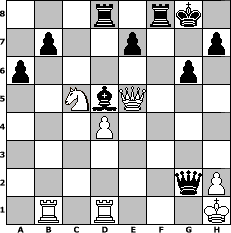 Partie-Notation im PGN-Format [Event "Gewitter im August"] [Site "www.mySchach.de"] [Date "2006.08.13"] [Round "1"] [White "helrobe"] [Black "BirdofPray1"] [ECO "B01"] [WhitemyELO "1844"] [BlackmyELO "2122"] [Result "0-1"] [TimeControl "10/864000"] [WhiteDays "29"] [BlackDays "21"] [MySchachNr "27649"] 1. e4 d5 2. exd5 Qxd5 3. Nc3 Qd8 4. d4 g6 5. Be3 Nh6 6. Nf3 Nf5 7. Bc4 Bg7 8. O-O O-O 9. Ne4 Nc6 10. c3 Na5 11. Bb3 Nxb3 12. axb3 Qd5 13. Ng3 Nxe3 14. fxe3 c5 15. e4 Qd6 16. e5 Qb6 17. Kh1 cxd4 18. cxd4 Be6 19. Ne4 Bxb3 20. Qe2 Bd5 21. Nc5 Rad8 22. Rfd1 a6 23. Ng5 f6 24. Nf3 fxe5 25. Nxe5 Bxe5 26. Qxe5 Qxb2 27. Rab1 Qxg2# 0-1 Stellungs-Notation im FEN-Format 3r1rk1/1p2p2p/p5p1/2NbQ3/3P4/8/6qP/1R1R3K - - - 0 28 Geschlagene Figuren Weiss: Geschlagene Figuren Schwarz: Klicken Sie auf eine geschlagene Figur um den gewünschten Zug darzustellen!