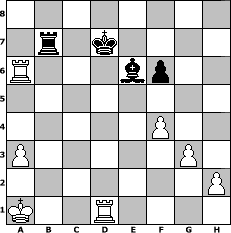 Partie-Notation im PGN-Format [Event "F"] [Site "www.mySchach.de"] [Date "2005.03.08"] [Round "1"] [White "bjeu"] [Black "Andreas"] [ECO "A57"] [WhitemyELO "2005"] [BlackmyELO "1678"] [Result "1-0"] [TimeControl "10/1728000"] [WhiteDays "120"] [BlackDays "115"] [MySchachNr "10988"] 1. d4 Nf6 2. c4 c5 3. d5 b5 4. cxb5 a6 5. Nc3 axb5 6. Nxb5 Bb7 7. Nc3 Qa5 8. Bd2 Qb6 9. e4 e6 10. Qf3 Na6 11. a3 exd5 12. Nxd5 Qe6 13. Nxf6+ gxf6 14. Qe3 Bxe4 15. f3 Bc6 16. O-O-O d5 17. Qf2 Be7 18. Re1 Qd6 19. Qh4 Bd7 20. Bh6 Rg8 21. Bf4 Qb6 22. Qxh7 Rf8 23. Bh6 Be6 24. Bxf8 Bxf8 25. Nh3 Rb8 26. Re2 Qb3 27. Qc2 Qa2 28. Re3 Bh6 29. f4 c4 30. Qb1 Qxb1+ 31. Kxb1 Kd7 32. g3 Bf5+ 33. Ka1 Nc5 34. Bg2 Nd3 35. Bxd5 Bxh3 36. Bxc4 Nc5 37. Rd1+ Kc6 38. Bxf7 Kb6 39. Rd6+ Kc7 40. Rd5 Bf8 41. b4 Nb7 42. Be6 Bg2 43. Rd7+ Kc6 44. Rd2 Bh1 45. Rd1 Bg2 46. Rg1 Bd5 47. Rc1+ Nc5 48. bxc5 Bxc5 49. Rec3 Bxe6 50. Rxc5+ Kd6 51. Rc6+ Kd7 52. Ra6 Rb7 53. Rd1+ 1-0 Stellungs-Notation im FEN-Format 8/1r1k4/R3bp2/8/5P2/P5P1/7P/K2R4 - - - 6 53 Geschlagene Figuren Weiss: Geschlagene Figuren Schwarz: Klicken Sie auf eine geschlagene Figur um den gewünschten Zug darzustellen!