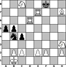 Partie-Notation im PGN-Format [Event "Chess for beginners"] [Site "www.mySchach.de"] [Date "2006.09.27"] [Round "1"] [Board "4"] [White "Nordisch"] [Black "stierdame1965"] [ECO "C21"] [WhitemyELO "1493"] [BlackmyELO "1050"] [Result "1-0"] [TimeControl "10/2592000"] [WhiteDays "30"] [BlackDays "30"] [MySchachNr "28968"] 1. e4 e5 2. d4 f6 3. dxe5 fxe5 4. Qh5+ g6 5. Qxe5+ Qe7 6. Qxh8 Qg7 7. Qxg7 Bxg7 8. Nc3 Nf6 9. e5 Nh5 10. g4 a5 11. Nd5 c6 12. Nc7+ Kf8 13. Nxa8 b5 14. gxh5 Bb7 15. Nb6 Bxe5 16. Bh6+ Bg7 17. Bxg7+ Kxg7 18. hxg6 Kxg6 19. Bd3+ Kf7 20. Nh3 c5 21. Rg1 c4 22. Bxh7 d5 23. O-O-O Na6 24. Nxd5 Bc8 25. Nb6 Nb4 26. Nxc8 Nxa2+ 27. Kb1 Nb4 28. Rd6 Ke8 29. Rg7 Kf8 30. Re7 1-0 Stellungs-Notation im FEN-Format 2N2k2/4R2B/3R4/pp6/1np5/7N/1PP1PP1P/1K6 - - - 7 30 Geschlagene Figuren Weiss: Geschlagene Figuren Schwarz: Klicken Sie auf eine geschlagene Figur um den gewünschten Zug darzustellen!