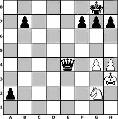 Partie-Notation im PGN-Format [Event "BDG"] [Site "www.mySchach.de"] [Date "2005.03.26"] [Round "2"] [White "icke"] [Black "Knight"] [ECO "D02"] [WhitemyELO "1322"] [BlackmyELO "1247"] [Result "0-1"] [TimeControl "10/1728000"] [WhiteDays "85"] [BlackDays "99"] [MySchachNr "11548"] 1. d4 d5 2. Nf3 Nf6 3. Nc3 e6 4. Bg5 Bb4 5. a3 Ba5 6. Bd2 Nc6 7. g3 O-O 8. Nb5 Ne4 9. Bxa5 Nxa5 10. Bh3 Nc4 11. Ne5 Nxb2 12. Qc1 Qf6 13. Nf3 Nc4 14. Nxc7 Rb8 15. O-O e5 16. Nxd5 Qd8 17. Bxc8 Rxc8 18. Nb4 a5 19. Nd3 exd4 20. Nf4 Nc3 21. e3 dxe3 22. fxe3 Re8 23. a4 Rxe3 24. Ng5 Nd2 25. Rf2 Nde4 26. Qxe3 Nxf2 27. Kxf2 Qxg5 28. h4 Qd8 29. Ra3 Nd1+ 30. Kf3 Nxe3 31. Rxe3 Rxc2 32. Re2 Rc3+ 33. Re3 Rxe3+ 34. Kxe3 Qb6+ 35. Kf3 Qc6+ 36. Kf2 Qxa4 37. Kg2 Qe4+ 38. Kh3 a4 39. Ng2 a3 40. g4 a2 0-1 Stellungs-Notation im FEN-Format 6k1/1p3ppp/8/8/4q1PP/7K/p5N1/8 - - - 0 41 Geschlagene Figuren Weiss: Geschlagene Figuren Schwarz: Klicken Sie auf eine geschlagene Figur um den gewünschten Zug darzustellen!