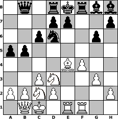 Partie-Notation im PGN-Format [Event "MLN 960er langsam 2014"] [Site "www.mySchach.de"] [Date "2014.01.31"] [Round "1"] [White "alibengali"] [Black "DianaHelmund"] [Variant "Fischerrandom"] [SetUp "1"] [FEN "nqnrkrbb/pppppppp/8/8/8/8/PPPPPPPP/NQNRKRBB w KQkq - 0 1"] [WhitemyELO "1629"] [BlackmyELO "1501"] [Result "1-0"] [TimeControl "10/3456000"] [WhiteDays "34"] [BlackDays "00"] [MySchachNr "92645"] 1. Nd3 f5 2. f4 g6 3. c3 c6 4. g3 Nc7 5. Nc2 Nd6 6. Bc5 Ne6 7. O-O-O Nxc5 8. Nxc5 b6 9. Nd3 a5 10. Rde1 b5 11. e4 fxe4 12. Bxe4 1-0 Stellungs-Notation im FEN-Format 1q1rkrbb/3pp2p/2pn2p1/pp6/4BP2/2PN2P1/PPNP3P/1QK1RR2 - kq - 0 12 Geschlagene Figuren Weiss: Geschlagene Figuren Schwarz: Klicken Sie auf eine geschlagene Figur um den gewünschten Zug darzustellen!