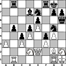 Partie-Notation im PGN-Format [Event "1-2009"] [Site "www.mySchach.de"] [Date "2009.01.01"] [Round "1"] [White "Master1"] [Black "steff"] [ECO "A43"] [WhitemyELO "1286"] [BlackmyELO "1207"] [Result "1/2-1/2"] [TimeControl "10/1728000"] [WhiteDays "29"] [BlackDays "54"] [MySchachNr "51219"] 1. d4 c5 2. c3 c4 3. e4 d5 4. e5 Nc6 5. Nf3 e6 6. Bg5 Be7 7. Bxe7 Qxe7 8. Be2 Nh6 9. O-O Nf5 10. Nbd2 O-O 11. b3 b5 12. b4 f6 13. a3 a5 14. bxa5 Nxa5 15. h3 Bd7 16. g4 Nh6 17. Nh2 f5 18. f3 f4 19. Rf2 Qh4 20. Rg2 Qxh3 21. Bf1 Qh4 22. Kh1 Nf7 23. Rb1 Ng5 24. Qe2 Rab8 25. Qf2 Qh6 26. Rg1 Nc6 27. Bg2 Ne7 28. Qe2 1/2-1/2 Stellungs-Notation im FEN-Format 1r3rk1/3bn1pp/4p2q/1p1pP1n1/2pP1pP1/P1P2P2/3NQ1BN/1R4RK - - - 15 28 Geschlagene Figuren Weiss: Geschlagene Figuren Schwarz: Klicken Sie auf eine geschlagene Figur um den gewünschten Zug darzustellen!