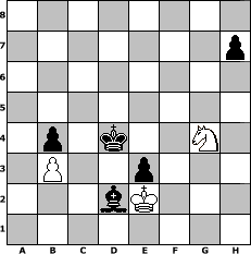 Partie-Notation im PGN-Format [Event "Pott Schach - Gl"] [Site "www.mySchach.de"] [Date "2016.10.25"] [Round "1"] [White "Schefsche"] [Black "FrankB"] [ECO "C02"] [WhitemyELO "1406"] [BlackmyELO "1668"] [Result "0-1"] [TimeControl "10/2592000"] [WhiteDays "158"] [BlackDays "162"] [MySchachNr "105339"] 1. e4 e6 2. d4 d5 3. e5 c5 4. Bb5+ Bd7 5. Bxd7+ Nxd7 6. Nf3 cxd4 7. Qxd4 Ne7 8. Bg5 Qc7 9. c3 Nc6 10. Qe3 Ncxe5 11. Nxe5 Qxe5 12. Qxe5 Nxe5 13. O-O f6 14. Be3 Be7 15. Nd2 Kf7 16. b3 a6 17. a4 Ng4 18. Rae1 Rac8 19. h3 Nxe3 20. Rxe3 Rc6 21. Re1 Rhc8 22. c4 dxc4 23. Nxc4 Bb4 24. R1e2 e5 25. Re4 Bc3 26. R2e3 Bd4 27. Rf3 Ke6 28. g4 g6 29. Re1 b5 30. axb5 axb5 31. Na5 Rc1 32. Rxc1 Rxc1+ 33. Kg2 Rc3 34. Rxc3 Bxc3 35. Nb7 Kd5 36. Kf3 Bb4 37. Ke3 Bc5+ 38. Ke2 Be7 39. Kd3 b4 40. f3 f5 41. gxf5 gxf5 42. Na5 Bg5 43. Nc4 e4+ 44. fxe4+ fxe4+ 45. Ke2 Kd4 46. Nd6 e3 47. Nb5+ Ke4 48. Nd6+ Kf4 49. Nf7 Bf6 50. Nh6 Bc3 51. Nf7 Bd2 52. Nh6 Kg3 53. Nf5+ Kxh3 54. Nh6 Kg3 55. Nf5+ Kf4 56. Nh6 Ke4 57. Ng4 Kd4 0-1 Stellungs-Notation im FEN-Format 8/7p/8/8/1p1k2N1/1P2p3/3bK3/8 - - - 8 58 Geschlagene Figuren Weiss: Geschlagene Figuren Schwarz: Klicken Sie auf eine geschlagene Figur um den gewünschten Zug darzustellen!