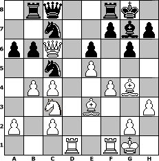 Partie-Notation im PGN-Format [Event "Master-Blitz"] [Site "www.mySchach.de"] [Date "2009.03.06"] [Round "1"] [White "bane"] [Black "RashimIbenRohal"] [ECO "A16"] [WhitemyELO "1804"] [BlackmyELO "1587"] [Result "1-0"] [TimeControl "10/86400"] [WhiteDays "02"] [BlackDays "01"] [MySchachNr "53323"] 1. c4 Nf6 2. Nc3 g6 3. e4 d6 4. d4 Bg7 5. Nf3 O-O 6. Be2 c6 7. O-O Bg4 8. Be3 Na6 9. h3 Bxf3 10. Bxf3 Nc7 11. Qb3 Rb8 12. e5 dxe5 13. dxe5 Nd7 14. Rad1 Qc8 15. Bg4 e6 16. f4 b6 17. Qa4 a6 18. Qxc6 Nc5 19. b4 1-0 Stellungs-Notation im FEN-Format 1rq2rk1/2n2pbp/ppQ1p1p1/2n1P3/1PP2PB1/2N1B2P/P1P3P1/3R1RK1 - - - 0 19 Geschlagene Figuren Weiss: Geschlagene Figuren Schwarz: Klicken Sie auf eine geschlagene Figur um den gewünschten Zug darzustellen!