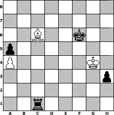Partie-Notation im PGN-Format [Event "Abermals Aljechin"] [Site "www.mySchach.de"] [Date "2011.02.13"] [Round "1"] [White "Schefsche"] [Black "kari6katz"] [ECO "A52"] [WhitemyELO "1361"] [BlackmyELO "1796"] [Result "0-1"] [TimeControl "10/1728000"] [WhiteDays "085"] [BlackDays "100"] [MySchachNr "71966"] 1. d4 Nf6 2. c4 e5 3. dxe5 Ng4 4. e4 d6 5. Nf3 Nxe5 6. Nxe5 dxe5 7. Qxd8+ Kxd8 8. Bd3 Bc5 9. O-O Nc6 10. Nc3 Nd4 11. Nd5 c6 12. Bg5+ Kd7 13. b4 Bf8 14. a4 cxd5 15. cxd5 Bxb4 16. f4 f6 17. Bh4 Bc5 18. fxe5 Nb3+ 19. Bf2 Bxf2+ 20. Kxf2 Nxa1 21. e6+ Ke7 22. Rxa1 a5 23. Rc1 Kd6 24. Bb5 h5 25. h4 g6 26. Ke3 Rf8 27. Kf4 Bxe6 28. dxe6 Kxe6 29. Rc5 Rfd8 30. Rc7 Rd2 31. g3 g5+ 32. Ke3 Rg2 33. hxg5 Rxg3+ 34. Kf4 Rxg5 35. Rxb7 Rg1 36. Bd7+ Kd6 37. Bb5 h4 38. Rh7 Rh1 39. Rh6 Rf8 40. e5+ Ke7 41. Rxf6 Rxf6+ 42. exf6+ Kxf6 43. Kg4 h3 44. Bc6 Rc1 0-1 Stellungs-Notation im FEN-Format 8/8/2B2k2/p7/P5K1/7p/8/2r5 - - - 2 45 Geschlagene Figuren Weiss: Geschlagene Figuren Schwarz: Klicken Sie auf eine geschlagene Figur um den gewünschten Zug darzustellen!