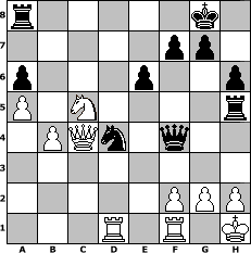 Partie-Notation im PGN-Format [Event "Alapin-Diemer-Gambit Thematurnier"] [Site "www.mySchach.de"] [Date "2010.01.23"] [Round "1"] [White "bane"] [Black "martinus"] [ECO "C01"] [WhitemyELO "1876"] [BlackmyELO "1744"] [Result "1/2-1/2"] [TimeControl "10/2592000"] [WhiteDays "59"] [BlackDays "86"] [MySchachNr "62588"] 1. e4 e6 2. d4 d5 3. Be3 dxe4 4. Ne2 Nf6 5. Ng3 b6 6. Bb5+ c6 7. Be2 Bb7 8. Nc3 Bb4 9. Bg5 h6 10. Bxf6 Bxc3+ 11. bxc3 Qxf6 12. Nxe4 Qe7 13. O-O O-O 14. Bf3 Rd8 15. a4 c5 16. a5 cxd4 17. cxd4 b5 18. Nc5 Bd5 19. c3 Nc6 20. Re1 a6 21. Qe2 b4 22. Bxd5 Rxd5 23. cxb4 Nxd4 24. Qc4 Qg5 25. Kh1 Qf5 26. Rf1 Qf4 27. Rad1 Rh5 1/2-1/2 Stellungs-Notation im FEN-Format r5k1/5pp1/p3p2p/P1N4r/1PQn1q2/8/5PPP/3R1R1K - - - 8 28 Geschlagene Figuren Weiss: Geschlagene Figuren Schwarz: Klicken Sie auf eine geschlagene Figur um den gewünschten Zug darzustellen!