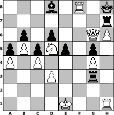 Partie-Notation im PGN-Format [Event "Tansanit"] [Site "www.mySchach.de"] [Date "2023.06.11"] [Round "2"] [White "Andreas1954"] [Black "borsti"] [ECO "C20"] [WhitemyELO "1236"] [BlackmyELO "1255"] [Result "1-0"] [TimeControl "10/864000"] [WhiteDays "10"] [BlackDays "10"] [MySchachNr "130138"] 1. e4 e5 2. d3 Nc6 3. Be2 Bc5 4. Nf3 d6 5. a3 h6 6. b4 Bb6 7. c3 Be6 8. b5 Na5 9. c4 Qf6 10. Bd2 Nb3 11. Qxb3 Ne7 12. a4 a5 13. Bc3 O-O 14. Qd1 c5 15. Ra2 Ng6 16. h4 h5 17. Bd2 Bd8 18. Bg5 Nf4 19. Bxf6 Bxf6 20. Rg1 b6 21. g3 Ng6 22. Bf1 Bg4 23. Be2 Bxf3 24. Bxf3 Rad8 25. Bxh5 Ne7 26. f3 g6 27. Bg4 Bg7 28. Rh2 f5 29. exf5 Nxf5 30. Bxf5 Rxf5 31. g4 Rf7 32. h5 g5 33. h6 Bf6 34. Rgh1 Kh7 35. Qe2 Be7 36. Qe4+ Kh8 37. Qg6 Rh7 38. Nc3 Rg8 39. Qe4 Rf8 40. Nd5 Bd8 41. Qg6 Rxf3 42. Rf2 Rg3 43. Rf8# 1-0 Stellungs-Notation im FEN-Format 3b1R1k/7r/1p1p2QP/pPpNp1p1/P1P3P1/3P2r1/8/4K2R - - - 3 43 Geschlagene Figuren Weiss: Geschlagene Figuren Schwarz: Klicken Sie auf eine geschlagene Figur um den gewünschten Zug darzustellen!