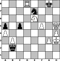 Partie-Notation im PGN-Format [Event "In Memorium Michael Knopf"] [Site "www.mySchach.de"] [Date "2012.04.10"] [Round "1"] [White "Master1"] [Black "Achimkogge"] [ECO "D00"] [WhitemyELO "1355"] [BlackmyELO "1421"] [Result "1-0"] [TimeControl "10/2592000"] [WhiteDays "141"] [BlackDays "121"] [MySchachNr "81093"] 1. d4 d5 2. e3 Bf5 3. Bd3 e6 4. Nf3 Bb4+ 5. c3 Bd6 6. Bxf5 exf5 7. Nbd2 Nd7 8. O-O f6 9. Qe2 c6 10. Nh4 g6 11. f4 Ne7 12. c4 b6 13. b3 Bb4 14. a3 Bc3 15. Rb1 a5 16. Bb2 Bxb2 17. Rxb2 Kf7 18. a4 c5 19. Nhf3 Qc7 20. g3 h5 21. h4 Rag8 22. Kg2 Nf8 23. Kh3 Ne6 24. Rd1 g5 25. fxg5 fxg5 26. cxd5 g4+ 27. Kh2 gxf3 28. dxe6+ Kxe6 29. Qxf3 Rg4 30. dxc5 bxc5 31. Nc4 Rd8 32. Rbd2 Rg6 33. Rxd8 Kf7 34. Nd6+ Ke6 35. Nb5 Qe5 36. R1d6+ Kf7 37. e4 Qb2+ 38. Kh3 Rg4 39. R8d7 Ke8 40. Nc7+ Kf8 41. exf5 Rb4 42. Qxh5 Rb8 43. Ne6+ Kg8 44. Rd8+ Rxd8 45. Rxd8# 1-0 Stellungs-Notation im FEN-Format 3R2k1/4n3/4N3/p1p2P1Q/P6P/1P4PK/1q6/8 - - - 0 45 Geschlagene Figuren Weiss: Geschlagene Figuren Schwarz: Klicken Sie auf eine geschlagene Figur um den gewünschten Zug darzustellen!