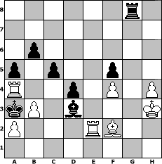Partie-Notation im PGN-Format [Event "Ja, is denn heut scho Weihnachten?"] [Site "www.mySchach.de"] [Date "2014.12.06"] [Round "1"] [White "Ziegert"] [Black "borsti"] [ECO "C41"] [WhitemyELO "1226"] [BlackmyELO "1235"] [Result "1-0"] [TimeControl "10/2592000"] [WhiteDays "035"] [BlackDays "150"] [MySchachNr "97057"] 1. e4 e5 2. Nf3 d6 3. Bc4 h6 4. O-O Bg4 5. d3 a5 6. Be3 Qf6 7. Nbd2 Nd7 8. Qe1 b6 9. h3 Bh5 10. Bd5 O-O-O 11. d4 Bg6 12. dxe5 Nxe5 13. Qe2 Ne7 14. Qa6+ Kd7 15. Nxe5+ Qxe5 16. Qc4 Nxd5 17. exd5 Be7 18. Bd4 Qf5 19. Bxg7 Rhg8 20. Bxh6 Qxc2 21. Qxc2 Bxc2 22. Rac1 Bd3 23. Rfe1 Bg5 24. Bxg5 Rde8 25. Be3 f5 26. Nf3 Be4 27. Ng5 Bxd5 28. b3 c5 29. Nh7 Rxg2+ 30. Kf1 Reg8 31. Nf6+ Kc6 32. Nxg8 Rxg8 33. h4 Bg2+ 34. Ke2 Re8 35. f4 Rh8 36. Kf2 Be4 37. Kg3 Kb5 38. Rc4 d5 39. Rcc1 Rg8+ 40. Kh3 d4 41. Bf2 Kb4 42. Rc4+ Ka3 43. Re2 Bd3 44. Ra4# 1-0 Stellungs-Notation im FEN-Format 6r1/8/1p6/p1p2p2/R2p1P1P/kP1b3K/P3RB2/8 - - - 7 44 Geschlagene Figuren Weiss: Geschlagene Figuren Schwarz: Klicken Sie auf eine geschlagene Figur um den gewünschten Zug darzustellen!
