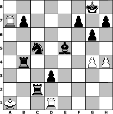 Partie-Notation im PGN-Format [Event "FREUNDSCHAFTSTUNIER2"] [Site "www.mySchach.de"] [Date "2007.11.24"] [Round "1"] [White "Master1"] [Black "jeremyt"] [ECO "A40"] [WhitemyELO "1344"] [BlackmyELO "1622"] [Result "0-1"] [TimeControl "10/3456000"] [WhiteDays "195"] [BlackDays "177"] [MySchachNr "40077"] 1. d4 g6 2. Nf3 Bg7 3. e4 c5 4. Bf4 cxd4 5. Nxd4 e5 6. Bxe5 Bxe5 7. Bc4 Qb6 8. Qf3 Bxd4 9. Nd2 Nf6 10. c3 Qxb2 11. Rb1 Qxc3 12. Qxc3 Bxc3 13. f3 Nc6 14. a3 Nd4 15. Rc1 Bb2 16. Rb1 Bxa3 17. Bd3 O-O 18. e5 Re8 19. f4 d5 20. O-O Nd7 21. Nf3 Bc5 22. Nxd4 Bxd4+ 23. Kh1 Nc5 24. Bb5 Rd8 25. Rbd1 Be3 26. Rfe1 Bg4 27. Be2 Bxe2 28. Rxe2 Bxf4 29. g3 Bh6 30. Kg2 d4 31. h4 d3 32. Rb2 Bg7 33. g4 Rd4 34. Ra2 Bxe5 35. Kf3 Rf4+ 36. Ke3 Re8 37. Rxa7 Bb8+ 38. Kd2 Re2+ 39. Kc1 Rc2+ 40. Kb1 Rb4+ 41. Ka1 Be5# 0-1 Stellungs-Notation im FEN-Format 6k1/Rp3p1p/6p1/2n1b3/1r4PP/3p4/2r5/K2R4 - - - 9 42 Geschlagene Figuren Weiss: Geschlagene Figuren Schwarz: Klicken Sie auf eine geschlagene Figur um den gewünschten Zug darzustellen!