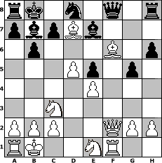 Partie-Notation im PGN-Format [Event "Wanderpokal 2007"] [Site "www.mySchach.de"] [Date "2007.06.23"] [Round "1"] [White "Baehr008"] [Black "MartinSilies"] [Variant "Fischerrandom"] [SetUp "1"] [FEN "rkbnnbqr/pppppppp/8/8/8/8/PPPPPPPP/RKBNNBQR w KQkq - 0 1"] [WhitemyELO "2142"] [BlackmyELO "1426"] [Result "1-0"] [TimeControl "10/864000"] [WhiteDays "11"] [BlackDays "04"] [MySchachNr "35959"] 1. d4 Nf6 2. Nc3 e6 3. f3 d5 4. Bd2 Bd6 5. e4 dxe4 6. fxe4 e5 7. d5 b6 8. Bb5 Bb7 9. Qe3 Nd7 10. Bxd7 Qf8 11. Qh3 g6 12. Bg5 f6 13. Rf1 Be7 14. Qh4 h6 15. Bxf6 g5 16. Qf2 1-0 Stellungs-Notation im FEN-Format rk1n1q1r/pbpBb3/1p3B1p/3Pp1p1/4P3/2N5/PPP2QPP/RK2NR2 - Qkq - 1 16 Geschlagene Figuren Weiss: Geschlagene Figuren Schwarz: Klicken Sie auf eine geschlagene Figur um den gewünschten Zug darzustellen!