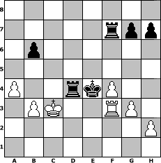 Partie-Notation im PGN-Format [Event "CCF Turnier"] [Site "www.mySchach.de"] [Date "2005.09.27"] [Round "1"] [White "Look"] [Black "Kitama"] [ECO "D00"] [WhitemyELO "1709"] [BlackmyELO "1649"] [Result "0-1"] [TimeControl "10/2592000"] [WhiteDays "118"] [BlackDays "120"] [MySchachNr "17889"] 1. d4 d5 2. g3 Nc6 3. Bg2 Nf6 4. Nf3 Bf5 5. c3 Be4 6. Nbd2 e5 7. Nxe4 dxe4 8. Nxe5 Nxe5 9. dxe5 Qxd1+ 10. Kxd1 O-O-O+ 11. Kc2 Ng4 12. Bh3 f5 13. Bxg4 fxg4 14. Be3 Rd5 15. Bxa7 b6 16. a4 Kb7 17. Bxb6 cxb6 18. Rhd1 Rxe5 19. Rd8 Rf5 20. Rf1 Rf7 21. Kd2 e3+ 22. Kxe3 Bc5+ 23. Rd4 Bxd4+ 24. cxd4 Re8+ 25. Kd3 Ra8 26. b3 Raf8 27. Ke3 Kc6 28. f4 gxf3 29. exf3 Kd5 30. f4 Re8+ 31. Kd3 Re4 32. Rf3 Rxd4+ 33. Kc3 Ke4 0-1 Stellungs-Notation im FEN-Format 8/5rpp/1p6/8/P2rkP2/1PK2RP1/7P/8 - - - 2 34 Geschlagene Figuren Weiss: Geschlagene Figuren Schwarz: Klicken Sie auf eine geschlagene Figur um den gewünschten Zug darzustellen!