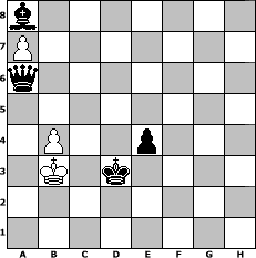 Partie-Notation im PGN-Format [Event "?"] [Site "www.mySchach.de"] [Date "2025.07.23"] [Round "?"] [White "borsti"] [Black "peter58"] [ECO "C62"] [WhitemyELO "1177"] [BlackmyELO "1517"] [Result "0-1"] [TimeControl "10/864000"] [WhiteDays "36"] [BlackDays "50"] [MySchachNr "133538"] 1. e4 e5 2. Nf3 Nc6 3. Bb5 d6 4. Bxc6+ bxc6 5. d4 exd4 6. Qxd4 Nf6 7. e5 c5 8. Qd1 Ng4 9. h3 Nxe5 10. Nxe5 dxe5 11. Qxd8+ Kxd8 12. Nc3 c6 13. Be3 Ba6 14. O-O-O+ Kc7 15. Ne4 Be7 16. Rd2 c4 17. c3 f5 18. Bg5 Bxg5 19. Nxg5 Bc8 20. Nf7 Re8 21. Rhd1 e4 22. Nd6 Rd8 23. Nb5+ cxb5 24. Rxd8 Kb7 25. Rf8 Be6 26. Rxa8 Kxa8 27. Rd6 Bc8 28. Rd8 Kb7 29. Rh8 g5 30. Rxh7+ Kb6 31. Kd2 a5 32. b4 axb4 33. cxb4 Kc6 34. Rh6+ Kd5 35. Kc3 Ke5 36. g3 f4 37. Rh8 Be6 38. Rb8 Bd7 39. Rb7 Bc6 40. gxf4+ gxf4 41. h4 Bxb7 42. h5 Kf6 43. Kd4 Kg5 44. Kc3 Kxh5 45. a4 Bc6 46. a5 Kg4 47. Kd2 Kf3 48. Ke1 c3 49. a6 c2 50. Kd2 Kxf2 51. Kxc2 Ke2 52. a7 f3 53. Kc3 f2 54. Kd4 f1=Q 55. Kc5 Ba8 56. Kxb5 Qf6 57. Ka4 Qa6+ 58. Kb3 Kd3 0-1 Stellungs-Notation im FEN-Format b7/P7/q7/8/1P2p3/1K1k4/8/8 - - - 5 59 Geschlagene Figuren Weiss: Geschlagene Figuren Schwarz: Klicken Sie auf eine geschlagene Figur um den gewünschten Zug darzustellen!