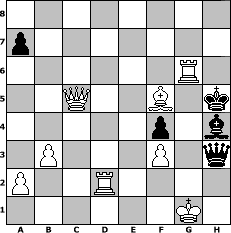 Partie-Notation im PGN-Format [Event "Trainingslager II"] [Site "www.mySchach.de"] [Date "2011.05.24"] [Round "2"] [White "augustus"] [Black "reisender"] [ECO "C55"] [WhitemyELO "1236"] [BlackmyELO "1322"] [Result "1-0"] [TimeControl "10/1728000"] [WhiteDays "20"] [BlackDays "20"] [MySchachNr "74151"] 1. e4 e5 2. Nf3 Nc6 3. Bc4 Nf6 4. d3 Bc5 5. Ng5 d5 6. exd5 Nd4 7. O-O Nxd5 8. Nc3 c6 9. Nce4 Be7 10. Nf3 Nxf3+ 11. Qxf3 O-O 12. c3 Be6 13. Qe2 f5 14. Ng3 f4 15. Nh5 Bf7 16. Qxe5 Bxh5 17. Qxh5 Bg5 18. f3 g6 19. Qg4 h5 20. Qe6+ Kh7 21. d4 Rf6 22. Qh3 Qd6 23. Bd3 c5 24. Qxh5+ Bh6 25. Qh4 Rg8 26. c4 Ne3 27. Re1 cxd4 28. Re2 Kg7 29. Be4 Qc5 30. b3 Rd8 31. Bb2 b5 32. Rc1 Bg5 33. Qe1 Rh8 34. cxb5 Qxb5 35. Bxd4 Rh5 36. Bxf6+ Bxf6 37. Rd2 Bh4 38. Rc7+ Kh6 39. Qc1 Qb6 40. Kh1 Bg3 41. h3 Qe6 42. Rc6 Rxh3+ 43. gxh3 Qxh3+ 44. Kg1 Bh4 45. Rxg6+ Kh5 46. Qc5+ Nf5 47. Bxf5 1-0 Stellungs-Notation im FEN-Format 8/p7/6R1/2Q2B1k/5p1b/1P3P1q/P2R4/6K1 - - - 0 47 Geschlagene Figuren Weiss: Geschlagene Figuren Schwarz: Klicken Sie auf eine geschlagene Figur um den gewünschten Zug darzustellen!