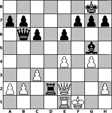 Partie-Notation im PGN-Format [Event "unter uns Nr. 30 (Weihnachtsturnier)"] [Site "www.mySchach.de"] [Date "2015.12.21"] [Round "1"] [White "Mattheus"] [Black "reisinger"] [ECO "D00"] [WhitemyELO "1163"] [BlackmyELO "1486"] [Result "0-1"] [TimeControl "10/2592000"] [WhiteDays "90"] [BlackDays "89"] [MySchachNr "101738"] 1. d4 d5 2. e4 dxe4 3. Nc3 Nf6 4. f3 Nc6 5. Be3 Nd5 6. Nxe4 Nxe3 7. Qd2 Nxd4 8. Rc1 Nxf1 9. Kxf1 Bf5 10. Ne2 Nxe2 11. Qxe2 c6 12. Kf2 e6 13. Rhd1 Qb6+ 14. Kf1 Be7 15. Rb1 O-O 16. c3 Rfd8 17. Rxd8+ Rxd8 18. g4 Bxe4 19. fxe4 Bg5 20. Re1 Rd2 0-1 Stellungs-Notation im FEN-Format 6k1/pp3ppp/1qp1p3/6b1/4P1P1/2P5/PP1rQ2P/4RK2 - - - 3 21 Geschlagene Figuren Weiss: Geschlagene Figuren Schwarz: Klicken Sie auf eine geschlagene Figur um den gewünschten Zug darzustellen!