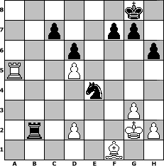 Partie-Notation im PGN-Format [Event "Schach dem "Nikolaus II""] [Site "www.mySchach.de"] [Date "2010.11.13"] [Round "1"] [White "reisinger"] [Black "sprinterde"] [ECO "A40"] [WhitemyELO "1422"] [BlackmyELO "1600"] [Result "0-1"] [TimeControl "10/2592000"] [WhiteDays "120"] [BlackDays "120"] [MySchachNr "69796"] 1. d4 e6 2. c4 Nf6 3. Nc3 Bb4 4. Bf4 O-O 5. a3 Bxc3+ 6. bxc3 Nc6 7. Nf3 d6 8. d5 exd5 9. cxd5 Ne7 10. c4 Ng6 11. Bg5 h6 12. Bxf6 Qxf6 13. e3 Bg4 14. Be2 Bxf3 15. Bxf3 Qc3+ 16. Kf1 Qxc4+ 17. Be2 Qc3 18. a4 Ne7 19. Rc1 Qa5 20. Bf3 Rac8 21. g3 b5 22. Kg2 Qxa4 23. Qxa4 bxa4 24. Ra1 Ra8 25. Rxa4 Rfb8 26. Rc1 Rb7 27. e4 Ng6 28. Be2 a5 29. Rca1 Rb2 30. Bf1 Ne5 31. Rxa5 Rxa5 32. Rxa5 Ng4 33. Bd3 Nxf2 34. Bf1 Nxe4+ 0-1 Stellungs-Notation im FEN-Format 6k1/2p2pp1/3p3p/R2P4/4n3/6P1/1r1P2KP/5B2 - - - 0 35 Geschlagene Figuren Weiss: Geschlagene Figuren Schwarz: Klicken Sie auf eine geschlagene Figur um den gewünschten Zug darzustellen!