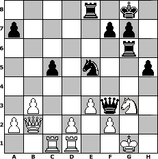 Partie-Notation im PGN-Format [Event "1-2009"] [Site "www.mySchach.de"] [Date "2009.01.01"] [Round "1"] [White "Naunhofer"] [Black "neve"] [ECO "?"] [WhitemyELO "1580"] [BlackmyELO "1518"] [Result "0-1"] [TimeControl "10/1728000"] [WhiteDays "78"] [BlackDays "60"] [MySchachNr "51248"] 1. d4 Nf6 2. c4 e6 3. Nc3 d5 4. Nf3 c6 5. e3 Nbd7 6. Be2 Bd6 7. O-O dxc4 8. Bxc4 b5 9. Be2 b4 10. Na4 e5 11. b3 Qc7 12. dxe5 Nxe5 13. h3 Nxf3+ 14. Bxf3 Be5 15. Bb2 Bxb2 16. Nxb2 O-O 17. Qc2 Bb7 18. Rac1 Rac8 19. Nd3 c5 20. Nxb4 Bxf3 21. gxf3 Qd7 22. Nd3 Qxh3 23. Ne1 Rfe8 24. Qb2 Nd7 25. Nd3 Rc6 26. Nf4 Qxf3 27. Ne2 Ne5 28. Rfd1 Rg6+ 29. Ng3 h5 0-1 Stellungs-Notation im FEN-Format 4r1k1/p4pp1/6r1/2p1n2p/8/1P2PqN1/PQ1P1P2/2RR2K1 - - - 0 30 Geschlagene Figuren Weiss: Geschlagene Figuren Schwarz: Klicken Sie auf eine geschlagene Figur um den gewünschten Zug darzustellen!
