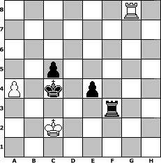 Partie-Notation im PGN-Format [Event "Gegengambit 2"] [Site "www.mySchach.de"] [Date "2014.08.02"] [Round "2"] [White "Cuibono"] [Black "Erich"] [ECO "C31"] [WhitemyELO "2003"] [BlackmyELO "2062"] [Result "0-1"] [TimeControl "10/2592000"] [WhiteDays "196"] [BlackDays "209"] [MySchachNr "95348"] 1. e4 e5 2. f4 d5 3. exd5 exf4 4. Nf3 Nf6 5. Be2 Nxd5 6. O-O Bd6 7. c4 Ne7 8. d4 c6 9. Nc3 O-O 10. Bd3 Ng6 11. Bd2 a5 12. Ne4 Be7 13. Nf2 Nd7 14. Re1 Bd6 15. Qc1 Bc7 16. c5 Nh4 17. Bxf4 Nxf3+ 18. gxf3 Nf6 19. Bxc7 Qxc7 20. Bc4 Be6 21. Ne4 Nxe4 22. Rxe4 Qd8 23. Bxe6 fxe6 24. Qe3 Qd5 25. a4 Rf6 26. h3 Raf8 27. Rf1 Rh6 28. Kh2 Qf5 29. Rg4 Rh5 30. Qb3 Rf7 31. Kg2 Rg5 32. Qe3 Rg6 33. Rf2 h5 34. Rxg6 Qxg6+ 35. Kh2 Qf5 36. Kg2 h4 37. f4 Kh7 38. Kg1 Rf6 39. b3 Kh8 40. Kh2 Kg8 41. Qe5 Qxe5 42. dxe5 Rf5 43. Kg1 g5 44. fxg5 Rxe5 45. Rc2 Kf7 46. Rc4 Rxg5+ 47. Kf2 Rg3 48. b4 Rxh3 49. bxa5 Kf6 50. Rb4 Rc3 51. Rxb7 Rxc5 52. a6 Ra5 53. Rb4 Rxa6 54. Rxh4 Ke7 55. Ke3 c5 56. Kd3 Ra8 57. Re4 Kd6 58. Kc3 Ra7 59. Rc4 Kd5 60. Rg4 e5 61. Kd3 Rf7 62. Rg8 e4+ 63. Kc3 Rf3+ 64. Kc2 Kc4 0-1 Stellungs-Notation im FEN-Format 6R1/8/8/2p5/P1k1p3/5r2/2K5/8 - - - 4 65 Geschlagene Figuren Weiss: Geschlagene Figuren Schwarz: Klicken Sie auf eine geschlagene Figur um den gewünschten Zug darzustellen!