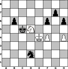 Partie-Notation im PGN-Format [Event "1. Weltmeisterschaft @ myschach.de"] [Site "www.mySchach.de"] [Date "2006.09.15"] [Round "2"] [White "Bauer91"] [Black "ujack1961"] [ECO "B01"] [WhitemyELO "1495"] [BlackmyELO "1774"] [Result "0-1"] [TimeControl "10/2592000"] [WhiteDays "150"] [BlackDays "150"] [MySchachNr "28502"] 1. e4 d5 2. exd5 Qxd5 3. Nc3 Qa5 4. d3 e5 5. Bd2 c6 6. Nce2 Qc7 7. g3 Nf6 8. Bg2 Be6 9. Nf3 Be7 10. O-O Nbd7 11. Bg5 O-O 12. Qd2 Rac8 13. b3 Nd5 14. Bxe7 Nxe7 15. c4 Rfd8 16. Rfe1 Nc5 17. Nc3 Nxd3 18. Re3 Nf4 19. Qe1 Nxg2 20. Kxg2 f6 21. Rd1 Rxd1 22. Qxd1 Rd8 23. Qe2 Bg4 24. h3 Bxf3+ 25. Rxf3 Rd4 26. Rd3 Qd7 27. Rxd4 Qxd4 28. Ne4 Kf7 29. f3 h6 30. Qd2 Qxd2+ 31. Nxd2 Nf5 32. Ne4 Ke7 33. c5 b6 34. b4 Ne3+ 35. Kf2 Nc2 36. cxb6 axb6 37. b5 cxb5 38. Nc3 Nd4 39. Ke3 Kd6 40. f4 Kc5 41. Ke4 exf4 42. gxf4 b4 43. Nd5 b3 44. axb3 Nxb3 45. h4 Nd2+ 0-1 Stellungs-Notation im FEN-Format 8/6p1/1p3p1p/2kN4/4KP1P/8/3n4/8 - - - 1 46 Geschlagene Figuren Weiss: ![]() ![]() ![]() ![]() ![]() ![]() ![]() ![]() ![]() ![]() ![]() ![]() ![]() ![]() ![]() Geschlagene Figuren Schwarz: ![]() ![]() ![]() ![]() ![]() ![]() ![]() ![]() ![]() ![]() ![]() ![]() ![]() ![]() ![]() Klicken Sie auf eine geschlagene Figur um den gewünschten Zug darzustellen!
