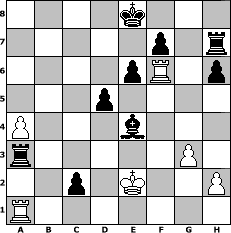 Partie-Notation im PGN-Format [Event "80 Jahre Weltmeister Max Euwe"] [Site "www.mySchach.de"] [Date "2015.07.20"] [Round "1"] [White "Naunhofer"] [Black "sprinterde"] [ECO "A40"] [WhitemyELO "1617"] [BlackmyELO "1727"] [Result "0-1"] [TimeControl "10/2592000"] [WhiteDays "120"] [BlackDays "118"] [MySchachNr "99795"] 1. d4 e6 2. Nf3 Nf6 3. c4 c5 4. Bg5 h6 5. Bh4 cxd4 6. Nxd4 Bb4+ 7. Nd2 g5 8. Bg3 Ne4 9. N4f3 Qa5 10. a3 Bxd2+ 11. Nxd2 Nxd2 12. Qxd2 Qxd2+ 13. Kxd2 Nc6 14. Bd6 b6 15. g3 Na5 16. Kc3 Bb7 17. f3 Rc8 18. e4 g4 19. b4 Nxc4 20. Bxc4 b5 21. Bc5 bxc4 22. Rhf1 gxf3 23. Rxf3 Bxe4 24. Rf4 d5 25. Rf6 a5 26. Raf1 Rh7 27. Kd4 axb4 28. Bxb4 c3 29. Ke3 c2 30. Kd2 Rc4 31. Ra1 Rd4+ 32. Ke2 Rd3 33. a4 Rb3 34. Ba3 Rxa3 0-1 Stellungs-Notation im FEN-Format 4k3/5p1r/4pR1p/3p4/P3b3/r5P1/2p1K2P/R7 - - - 0 35 Geschlagene Figuren Weiss: Geschlagene Figuren Schwarz: Klicken Sie auf eine geschlagene Figur um den gewünschten Zug darzustellen!