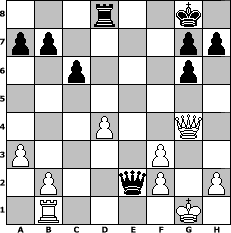 Partie-Notation im PGN-Format [Event "CP Clubmeisterschaft 2013"] [Site "www.mySchach.de"] [Date "2013.06.08"] [Round "1"] [White "Macks"] [Black "Ziegert"] [ECO "D20"] [WhitemyELO "1238"] [BlackmyELO "1586"] [Result "1-0"] [TimeControl "10/2592000"] [WhiteDays "30"] [BlackDays "00"] [MySchachNr "88639"] 1. d4 d5 2. c4 dxc4 3. e3 e5 4. Bxc4 exd4 5. exd4 Nf6 6. Nf3 Be7 7. O-O O-O 8. Bg5 Bg4 9. Nc3 c6 10. Rc1 Na6 11. a3 Bxf3 12. Qxf3 Nc7 13. Rfd1 Nfd5 14. Bxe7 Nxe7 15. Rd2 Ncd5 16. Ne4 Rc8 17. Qg3 Nf5 18. Qg4 Nfe7 19. Rd3 Ng6 20. Rg3 Nf6 21. Nxf6+ Qxf6 22. Bd3 Rcd8 23. Bxg6 fxg6 24. Rf3 Qe7 25. Rd1 Rxf3 26. gxf3 Qe2 27. Rb1 1-0 Stellungs-Notation im FEN-Format 3r2k1/pp4pp/2p3p1/8/3P2Q1/P4P2/1P2qP1P/1R4K1 - - - 2 27 Geschlagene Figuren Weiss: Geschlagene Figuren Schwarz: Klicken Sie auf eine geschlagene Figur um den gewünschten Zug darzustellen!