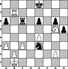 Partie-Notation im PGN-Format [Event "Die Weinlese 2014 m. 50.00 Eu 1.Preis"] [Site "www.mySchach.de"] [Date "2014.09.15"] [Round "1"] [White "Peterlie77 (C)"] [Black "bjeu"] [ECO "A40"] [WhitemyELO "2064"] [BlackmyELO "2183"] [Result "1-0"] [TimeControl "10/2592000"] [WhiteDays "30"] [BlackDays "00"] [MySchachNr "95920"] 1. d4 e6 2. e4 c5 3. Nf3 a6 4. Nc3 cxd4 5. Nxd4 Bb4 6. Bd2 d6 7. a3 Bc5 8. Nb3 Ba7 9. Qg4 Nf6 10. Qg3 e5 11. O-O-O Be6 12. Be2 Nbd7 13. f4 Rc8 14. fxe5 dxe5 15. Rhf1 Qc7 16. Kb1 O-O 17. Bh6 Ne8 18. Bg4 Bd4 19. Rd3 Nc5 20. Nxc5 Qxc5 21. Bxe6 fxe6 22. Rxf8+ Qxf8 23. Ne2 Qf1+ 24. Nc1 Qf2 25. Qxf2 Bxf2 26. Be3 Bxe3 27. Rxe3 Nf6 28. Nd3 Ng4 29. Rg3 Nxh2 30. Nxe5 Nf1 31. Rd3 h5 32. Nf3 Kf8 33. Rd7 Ne3 34. Ng5 Rc6 35. Rf7+ Ke8 36. c3 g6 37. Rxb7 1-0 Stellungs-Notation im FEN-Format 4k3/1R6/p1r1p1p1/6Np/4P3/P1P1n3/1P4P1/1K6 - - - 0 37 Geschlagene Figuren Weiss: Geschlagene Figuren Schwarz: Klicken Sie auf eine geschlagene Figur um den gewünschten Zug darzustellen!