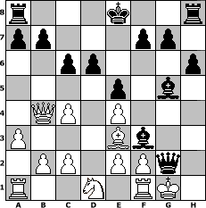 Partie-Notation im PGN-Format [Event "Obs stürmt oder schneit,zum Schach sind wir berei"] [Site "www.mySchach.de"] [Date "2017.11.16"] [Round "1"] [White "MiFie"] [Black "Rabenvogel"] [ECO "C50"] [WhitemyELO "1026"] [BlackmyELO "1550"] [Result "0-1"] [TimeControl "10/1728000"] [WhiteDays "18"] [BlackDays "20"] [MySchachNr "110378"] 1. e4 e5 2. Nf3 Nc6 3. Bc4 h6 4. O-O d6 5. h3 Nf6 6. d3 Na5 7. Nc3 Nxc4 8. dxc4 c6 9. Be3 Be7 10. g4 Qd7 11. a3 Nxg4 12. Nh2 Nxh2 13. Kxh2 Qxh3+ 14. Kg1 Bg4 15. Qe1 Bg5 16. Nd1 Bf3 17. Qb4 Qg2# 0-1 Stellungs-Notation im FEN-Format r3k2r/pp3pp1/2pp3p/4p1b1/1QP1P3/P3Bb2/1PP1PPq1/R2N1RK1 - kq - 8 18 Geschlagene Figuren Weiss: Geschlagene Figuren Schwarz: Klicken Sie auf eine geschlagene Figur um den gewünschten Zug darzustellen!