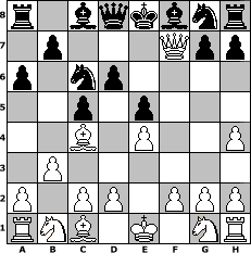 Partie-Notation im PGN-Format [Event "1500er unter sich !"] [Site "www.mySchach.de"] [Date "2006.03.18"] [Round "1"] [White "Navsan"] [Black "Milli"] [ECO "A00"] [WhitemyELO "1500"] [BlackmyELO "1305"] [Result "1-0"] [TimeControl "10/864000"] [WhiteDays "02"] [BlackDays "07"] [MySchachNr "23726"] 1. h4 c5 2. e4 a6 3. Qf3 Nc6 4. b3 d6 5. Bc4 e5 6. Qxf7# 1-0 Stellungs-Notation im FEN-Format r1bqkbnr/1p3Qpp/p1np4/2p1p3/2B1P2P/1P6/P1PP1PPP/RNB1K1NR - KQkq - 0 6 Geschlagene Figuren Weiss: Geschlagene Figuren Schwarz: Klicken Sie auf eine geschlagene Figur um den gewünschten Zug darzustellen!