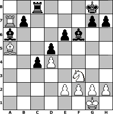 Partie-Notation im PGN-Format [Event "M"] [Site "www.mySchach.de"] [Date "2014.05.10"] [Round "1"] [White "alibengali"] [Black "orion"] [ECO "C02"] [WhitemyELO "1647"] [BlackmyELO "1684"] [Result "0-1"] [TimeControl "10/3456000"] [WhiteDays "36"] [BlackDays "40"] [MySchachNr "94346"] 1. e4 e6 2. d4 d5 3. e5 c5 4. c3 Nc6 5. Nf3 Qb6 6. a3 Bd7 7. b4 cxd4 8. cxd4 Rc8 9. Bb2 Nge7 10. Nc3 Na5 11. Rb1 Nc4 12. Bxc4 dxc4 13. O-O Nd5 14. Nxd5 exd5 15. Bc3 Be7 16. a4 O-O 17. Re1 Qg6 18. Re3 Bxa4 19. Qe1 Rc6 20. b5 Rb6 21. Ra1 Bxb5 22. Rxa7 Ba6 23. Nd2 Qg4 24. e6 Rxe6 25. Rxe6 Qxe6 26. Qxe6 fxe6 27. Ba5 Bf6 28. Nf3 Rc8 0-1 Stellungs-Notation im FEN-Format 2r3k1/Rp4pp/b3pb2/B2p4/2pP4/5N2/4PPPP/6K1 - - - 4 29 Geschlagene Figuren Weiss: Geschlagene Figuren Schwarz: Klicken Sie auf eine geschlagene Figur um den gewünschten Zug darzustellen!