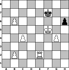 Partie-Notation im PGN-Format [Event "Herbstturnier 2"] [Site "www.mySchach.de"] [Date "2011.10.05"] [Round "1"] [White "Achimkogge"] [Black "alpacino"] [ECO "C22"] [WhitemyELO "1381"] [BlackmyELO "1285"] [Result "1-0"] [TimeControl "10/1728000"] [WhiteDays "20"] [BlackDays "20"] [MySchachNr "76602"] 1. e4 e5 2. d4 exd4 3. Qxd4 c5 4. Qe5+ Qe7 5. Qxe7+ Bxe7 6. Nf3 Nf6 7. Bc4 O-O 8. e5 Ne4 9. Bd5 Nd6 10. exd6 Bxd6 11. O-O Na6 12. Re1 Nb4 13. Bb3 b6 14. Na3 a6 15. Ng5 b5 16. Nxf7 Bc7 17. Nd6+ Kh8 18. Nf7+ Kg8 19. Nh6+ Kh8 20. Nf7+ Kg8 21. Nd6+ Kh8 22. Nxc8 Raxc8 23. Bd2 c4 24. Bxb4 cxb3 25. Bxf8 Rxf8 26. axb3 Bb6 27. Re2 b4 28. Nc4 Bc5 29. Rxa6 d6 30. Nxd6 Bxd6 31. Rxd6 h6 32. h4 Kh7 33. g4 Rf4 34. f3 Rxf3 35. Kg2 Rf4 36. Kg3 Rf1 37. Rb6 Rg1+ 38. Kf3 Rf1+ 39. Rf2 Rh1 40. h5 Rh3+ 41. Kf4 Rh1 42. Rxb4 Rb1 43. c3 Rd1 44. Rb6 g5+ 45. hxg6+ Kg7 46. b4 Rd7 47. Re2 Kf8 48. Kf5 Kg7 49. c4 Rc7 50. Rf6 Rb7 51. b5 Rc7 52. Rf7+ Rxf7+ 53. gxf7 Kxf7 54. b6 1-0 Stellungs-Notation im FEN-Format 8/5k2/1P5p/5K2/2P3P1/8/1P2R3/8 - - - 0 54 Geschlagene Figuren Weiss: Geschlagene Figuren Schwarz: Klicken Sie auf eine geschlagene Figur um den gewünschten Zug darzustellen!