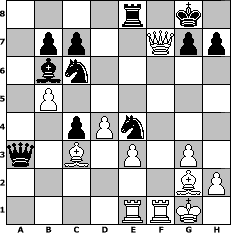 Partie-Notation im PGN-Format [Event "Zidans Schachturnier 2"] [Site "www.mySchach.de"] [Date "2010.03.26"] [Round "1"] [White "reisender"] [Black "Knight"] [ECO "A00"] [WhitemyELO "1394"] [BlackmyELO "1144"] [Result "1-0"] [TimeControl "10/3456000"] [WhiteDays "120"] [BlackDays "118"] [MySchachNr "64349"] 1. g3 d5 2. Bg2 Nf6 3. e3 e5 4. d4 e4 5. Nc3 Nc6 6. Nge2 Bb4 7. O-O O-O 8. Bd2 Bg4 9. a3 Ba5 10. b4 Bb6 11. Nb5 a6 12. c3 Bxe2 13. Qxe2 Re8 14. f3 exf3 15. Qxf3 a5 16. Rae1 Qe7 17. c4 dxc4 18. Bc3 axb4 19. axb4 Ra3 20. Nxa3 Ne4 21. b5 Qxa3 22. Qxf7+ 1-0 Stellungs-Notation im FEN-Format 4r1k1/1pp2Qpp/1bn5/1P6/2pPn3/q1B1P1P1/6BP/4RRK1 - - - 0 22 Geschlagene Figuren Weiss: Geschlagene Figuren Schwarz: Klicken Sie auf eine geschlagene Figur um den gewünschten Zug darzustellen!