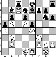 Partie-Notation im PGN-Format [Event "Neuj"] [Site "www.mySchach.de"] [Date "2012.01.01"] [Round "1"] [White "reisender"] [Black "gunni50"] [ECO "C44"] [WhitemyELO "1428"] [BlackmyELO "1224"] [Result "1-0"] [TimeControl "10/864000"] [WhiteDays "10"] [BlackDays "10"] [MySchachNr "78869"] 1. e4 e5 2. Nf3 Nc6 3. d4 d6 4. d5 Nce7 5. Be2 h6 6. O-O Nf6 7. c4 Nxe4 8. Bd3 Nc5 9. Bc2 c6 10. Nc3 a6 11. b4 Nd7 12. a4 cxd5 13. cxd5 b6 14. Bb3 Bb7 15. Re1 Qc7 16. Bb2 Ng6 17. Rc1 Rc8 18. b5 a5 19. Ne4 Be7 20. Rxc7 1-0 Stellungs-Notation im FEN-Format 2r1k2r/1bRnbpp1/1p1p2np/pP1Pp3/P3N3/1B3N2/1B3PPP/3QR1K1 - k - 0 20 Geschlagene Figuren Weiss: Geschlagene Figuren Schwarz: Klicken Sie auf eine geschlagene Figur um den gewünschten Zug darzustellen!