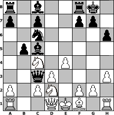 Partie-Notation im PGN-Format [Event "From-Gambit!"] [Site "www.mySchach.de"] [Date "2006.07.05"] [Round "2"] [White "Knight"] [Black "Dragonwolves"] [ECO "A02"] [WhitemyELO "1260"] [BlackmyELO "2215"] [Result "0-1"] [TimeControl "10/2592000"] [WhiteDays "57"] [BlackDays "55"] [MySchachNr "26796"] 1. f4 e5 2. fxe5 d6 3. exd6 Bxd6 4. Nf3 Nf6 5. d3 O-O 6. Bg5 h6 7. Bxf6 Qxf6 8. e4 Qxb2 9. Nbd2 Nc6 10. Nc4 Qc3+ 11. Nfd2 Bc5 12. h3 b5 0-1 Stellungs-Notation im FEN-Format r1b2rk1/p1p2pp1/2n4p/1pb5/2N1P3/2qP3P/P1PN1PP1/R2QKB1R - KQ - 0 13 Geschlagene Figuren Weiss: Geschlagene Figuren Schwarz: Klicken Sie auf eine geschlagene Figur um den gewünschten Zug darzustellen!