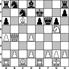 Partie-Notation im PGN-Format [Event "Open"] [Site "www.mySchach.de"] [Date "2016.01.17"] [Round "1"] [White "Helmut48"] [Black "lotchi"] [ECO "D06"] [WhitemyELO "1969"] [BlackmyELO "1059"] [Result "1-0"] [TimeControl "10/1728000"] [WhiteDays "39"] [BlackDays "20"] [MySchachNr "102144"] 1. d4 d5 2. c4 Nf6 3. cxd5 Nxd5 4. e4 Nb6 5. Nc3 Bd7 6. Nf3 Bg4 7. Be2 Bxf3 8. Bxf3 g6 9. e5 c6 10. O-O e6 11. Ne4 Nd5 12. a4 f5 13. exf6 a6 14. Ng5 Qxf6 15. Re1 Nc7 16. Qb3 Be7 17. Qxb7 Bd8 18. Bxc6+ Ke7 19. Qb4# 1-0 Stellungs-Notation im FEN-Format rn1b3r/2n1k2p/p1B1pqp1/6N1/PQ1P4/8/1P1P1PPP/R1B1R1K1 - - - 2 19 Geschlagene Figuren Weiss: Geschlagene Figuren Schwarz: Klicken Sie auf eine geschlagene Figur um den gewünschten Zug darzustellen!