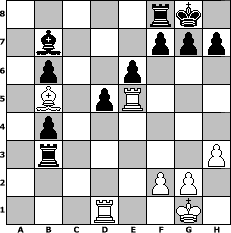 Partie-Notation im PGN-Format [Event "ZEPPELIN-OPEN-2014-02"] [Site "www.mySchach.de"] [Date "2014.10.13"] [Round "1"] [White "Mattheus"] [Black "FrankB"] [ECO "C10"] [WhitemyELO "1245"] [BlackmyELO "1739"] [Result "0-1"] [TimeControl "10/3456000"] [WhiteDays "40"] [BlackDays "40"] [MySchachNr "96334"] 1. e4 e6 2. d4 d5 3. Nc3 dxe4 4. Nxe4 Nf6 5. Nxf6+ Qxf6 6. Nf3 Nd7 7. b3 Bb4+ 8. Bd2 a5 9. Bxb4 axb4 10. Bc4 O-O 11. O-O c6 12. Re1 b6 13. Qe2 Bb7 14. Rad1 Rxa2 15. d5 cxd5 16. Bb5 Nc5 17. Qe5 Qxe5 18. Rxe5 Rxc2 19. Nd4 Rc3 20. h3 Nxb3 21. Nxb3 Rxb3 0-1 Stellungs-Notation im FEN-Format 5rk1/1b3ppp/1p2p3/1B1pR3/1p6/1r5P/5PP1/3R2K1 - - - 0 22 Geschlagene Figuren Weiss: Geschlagene Figuren Schwarz: Klicken Sie auf eine geschlagene Figur um den gewünschten Zug darzustellen!