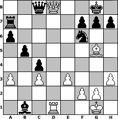 Partie-Notation im PGN-Format [Event "Schach dem Osterhasen IV"] [Site "www.mySchach.de"] [Date "2015.03.29"] [Round "1"] [White "reisinger"] [Black "Caligula"] [ECO "D35"] [WhitemyELO "1488"] [BlackmyELO "1385"] [Result "1-0"] [TimeControl "10/2592000"] [WhiteDays "90"] [BlackDays "72"] [MySchachNr "98707"] 1. d4 d5 2. c4 e6 3. Nc3 Nf6 4. Bf4 Nc6 5. e3 Bb4 6. a3 Bxc3+ 7. bxc3 dxc4 8. Bxc4 O-O 9. Ne2 a6 10. O-O b5 11. Ba2 Re8 12. h3 Bd7 13. Qc2 e5 14. dxe5 Nxe5 15. Rad1 Nc6 16. Nd4 Nxd4 17. Rxd4 Qc8 18. Rd1 c5 19. Rd6 c4 20. Bb1 Ra7 21. Bg5 Bf5 22. Qd2 Bxb1 23. Rd8 Rxd8 24. Qxd8+ 1-0 Stellungs-Notation im FEN-Format 2qQ2k1/r4ppp/p4n2/1p4B1/2p5/P1P1P2P/5PP1/1b1R2K1 - - - 0 24 Geschlagene Figuren Weiss: Geschlagene Figuren Schwarz: Klicken Sie auf eine geschlagene Figur um den gewünschten Zug darzustellen!