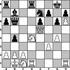 Partie-Notation im PGN-Format [Event "Sweety Tunier"] [Site "www.mySchach.de"] [Date "2006.02.28"] [Round "1"] [White "AlbertoAveiro"] [Black "Robert"] [ECO "B95"] [WhitemyELO "1517"] [BlackmyELO "1500"] [Result "1-0"] [TimeControl "10/2592000"] [WhiteDays "39"] [BlackDays "60"] [MySchachNr "22981"] 1. e4 c5 2. Nf3 d6 3. d4 cxd4 4. Nxd4 Nf6 5. Nc3 a6 6. Bg5 e6 7. Qd2 Be7 8. O-O-O O-O 9. Bd3 Qc7 10. h4 Nbd7 11. Kb1 Nc5 12. f3 Nxd3 13. Qxd3 Rd8 14. g4 b5 15. h5 b4 16. Nce2 Bb7 17. h6 g6 18. Nc1 d5 19. exd5 Nxd5 20. Bxe7 Nxe7 21. Qe2 Qb6 22. Qe5 1-0 Stellungs-Notation im FEN-Format r2r2k1/1b2np1p/pq2p1pP/4Q3/1p1N2P1/5P2/PPP5/1KNR3R - - - 3 22 Geschlagene Figuren Weiss: Geschlagene Figuren Schwarz: Klicken Sie auf eine geschlagene Figur um den gewünschten Zug darzustellen!