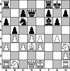 Partie-Notation im PGN-Format [Event "Vor dem Urlaub noch ein schnelles Turnier!"] [Site "www.mySchach.de"] [Date "2012.06.16"] [Round "1"] [White "BobbyF4"] [Black "reisender"] [ECO "A00"] [WhitemyELO "1512"] [BlackmyELO "1346"] [Result "1-0"] [TimeControl "10/864000"] [WhiteDays "05"] [BlackDays "00"] [MySchachNr "82262"] 1. Nc3 d5 2. d4 Nf6 3. Bg5 Be6 4. e3 g6 5. f3 Nc6 6. a3 Bg7 7. b4 O-O 8. Bd3 a6 9. Na4 b5 10. Nc5 Qc8 11. g4 Bd7 12. Nxd7 Qxd7 13. c3 e5 14. Nh3 e4 15. Bxf6 Bxf6 16. fxe4 1-0 Stellungs-Notation im FEN-Format r4rk1/2pq1p1p/p1n2bp1/1p1p4/1P1PP1P1/P1PBP2N/7P/RN1QK2R - KQ - 0 16 Geschlagene Figuren Weiss: Geschlagene Figuren Schwarz: Klicken Sie auf eine geschlagene Figur um den gewünschten Zug darzustellen!