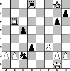 Partie-Notation im PGN-Format [Event "1.Badisches Dreik"] [Site "www.mySchach.de"] [Date "2014.01.07"] [Round "1"] [White "Wulfen49"] [Black "Knight"] [ECO "C45"] [WhitemyELO "1324"] [BlackmyELO "1243"] [Result "0-1"] [TimeControl "10/2592000"] [WhiteDays "30"] [BlackDays "30"] [MySchachNr "92209"] 1. e4 e5 2. Nf3 Nc6 3. d4 exd4 4. Nxd4 Nxd4 5. Qxd4 b6 6. Bc4 Bb7 7. O-O Nf6 8. e5 Ng8 9. Bd5 Bxd5 10. Qxd5 Ne7 11. Qd1 g6 12. Bg5 Bg7 13. Re1 O-O 14. Qd2 c5 15. Nc3 f6 16. exf6 Bxf6 17. Bh6 Rf7 18. Bg5 Bxg5 19. Qe2 d5 20. Rad1 d4 21. Ne4 Nd5 22. Nxg5 Qxg5 23. Qe5 Qxe5 24. Rxe5 Nc7 25. Rde1 Rff8 26. Re7 Nd5 27. Rd7 Nf6 28. Rb7 Rae8 29. Ree7 Rxe7 30. Rxe7 Ng4 31. f3 Ne3 32. Rxa7 Nxc2 33. Rb7 d3 34. Rxb6 Rd8 0-1 Stellungs-Notation im FEN-Format 3r2k1/7p/1R4p1/2p5/8/3p1P2/PPn3PP/6K1 - - - 1 35 Geschlagene Figuren Weiss: Geschlagene Figuren Schwarz: Klicken Sie auf eine geschlagene Figur um den gewünschten Zug darzustellen!