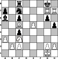 Partie-Notation im PGN-Format [Event "Weihnachts-Turnier 2006"] [Site "www.mySchach.de"] [Date "2006.12.24"] [Round "1"] [White "Jolilein"] [Black "paul"] [ECO "A20"] [WhitemyELO "1454"] [BlackmyELO "1314"] [Result "1-0"] [TimeControl "10/864000"] [WhiteDays "26"] [BlackDays "16"] [MySchachNr "31070"] 1. c4 e5 2. e4 Bb4 3. Nf3 Nc6 4. a3 Bd6 5. Be2 Nf6 6. Nc3 b6 7. d4 exd4 8. Nxd4 Be5 9. Ndb5 O-O 10. f4 Bxc3+ 11. Nxc3 d6 12. O-O Re8 13. Bf3 Na5 14. e5 dxe5 15. Qxd8 Rxd8 16. Bxa8 Nxc4 17. Bf3 Ba6 18. Be2 b5 19. fxe5 Ne8 20. Bxc4 bxc4 21. Be3 Rb8 22. Rf2 c6 23. Rd1 g6 24. Rd7 Rc8 25. Rfxf7 h5 26. Bc5 Nc7 27. Rg7+ Kh8 28. Rh7+ Kg8 29. Rdg7# 1-0 Stellungs-Notation im FEN-Format 2r3k1/p1n3RR/b1p3p1/2B1P2p/2p5/P1N5/1PP3PP/6K1 - - - 7 29 Geschlagene Figuren Weiss: ![]() ![]() ![]() ![]() ![]() ![]() ![]() ![]() ![]() ![]() ![]() ![]() ![]() ![]() ![]() Geschlagene Figuren Schwarz: ![]() ![]() ![]() ![]() ![]() ![]() ![]() ![]() ![]() ![]() ![]() ![]() ![]() ![]() ![]() Klicken Sie auf eine geschlagene Figur um den gewünschten Zug darzustellen!