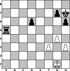 Partie-Notation im PGN-Format [Event "Neujahrsturnier 2007"] [Site "www.mySchach.de"] [Date "2007.01.01"] [Round "1"] [White "bluescreenlover"] [Black "jlarue700"] [ECO "C50"] [WhitemyELO "1406"] [BlackmyELO "1567"] [Result "0-1"] [TimeControl "10/864000"] [WhiteDays "18"] [BlackDays "34"] [MySchachNr "31285"] 1. e4 e5 2. Nf3 Nc6 3. Bc4 Bc5 4. O-O Nf6 5. Nc3 O-O 6. a3 a5 7. h3 d6 8. d3 h6 9. Qe1 Nd4 10. Nxd4 Bxd4 11. Ne2 Ba7 12. Kh1 Be6 13. Bxe6 fxe6 14. f3 Nh5 15. Ng3 Nf4 16. Bxf4 Rxf4 17. Qxa5 Bf2 18. Qb4 Bxg3 19. Qxb7 Rb8 20. Qa6 Rxb2 21. Qc4 d5 22. Qc3 Rb6 23. Qxe5 Qd6 24. Qxd6 cxd6 25. exd5 exd5 26. Rfb1 Rxb1+ 27. Rxb1 Ra4 28. Rb8+ Kh7 29. Rb3 Bf2 30. c3 Bc5 31. d4 Bxa3 32. Rb5 Rc4 33. Rxd5 Rxc3 34. Ra5 Rd3 35. d5 Bc5 36. Kh2 Rxd5 37. g4 Bg1+ 38. Kxg1 Rxa5 0-1 Stellungs-Notation im FEN-Format 8/6pk/3p3p/r7/6P1/5P1P/8/6K1 - - - 0 39 Geschlagene Figuren Weiss: Geschlagene Figuren Schwarz: Klicken Sie auf eine geschlagene Figur um den gewünschten Zug darzustellen!