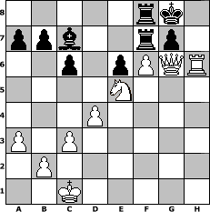 Partie-Notation im PGN-Format [Event "Jahresausklang."] [Site "www.mySchach.de"] [Date "2016.12.23"] [Round "1"] [White "lotchi"] [Black "alibengali"] [ECO "D00"] [WhitemyELO "1173"] [BlackmyELO "1659"] [Result "1-0"] [TimeControl "10/2592000"] [WhiteDays "120"] [BlackDays "120"] [MySchachNr "106153"] 1. d4 d5 2. e4 dxe4 3. Nc3 Nf6 4. f3 exf3 5. Qxf3 c6 6. Be3 Bg4 7. Qf2 e6 8. h3 Bh5 9. Nf3 Bb4 10. g4 Ne4 11. Qg2 Bg6 12. Bd2 Nxd2 13. Qxd2 O-O 14. Bd3 Bxd3 15. Qxd3 Nd7 16. O-O-O h6 17. Ne4 Qc7 18. a3 Be7 19. c3 f5 20. Nf2 fxg4 21. hxg4 Qf4+ 22. Nd2 Qxf2 23. Rxh6 Nf6 24. Rdh1 Qf4 25. Qg6 Qxh6 26. Rxh6 Rf7 27. g5 Raf8 28. Nc4 Bd8 29. Ne5 Bc7 30. gxf6 1-0 Stellungs-Notation im FEN-Format 5rk1/ppb2rp1/2p1pPQR/4N3/3P4/P1P5/1P6/2K5 - - - 0 30 Geschlagene Figuren Weiss: Geschlagene Figuren Schwarz: Klicken Sie auf eine geschlagene Figur um den gewünschten Zug darzustellen!