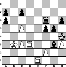 Partie-Notation im PGN-Format [Event "From-Gambit!"] [Site "www.mySchach.de"] [Date "2006.07.05"] [Round "1"] [White "nogumo"] [Black "HPB2005"] [ECO "A02"] [WhitemyELO "1855"] [BlackmyELO "1968"] [Result "0-1"] [TimeControl "10/2592000"] [WhiteDays "109"] [BlackDays "071"] [MySchachNr "26762"] 1. f4 e5 2. fxe5 d6 3. Nf3 Nc6 4. exd6 Bg4 5. e4 Nf6 6. Bb5 Qxd6 7. Bxc6+ Qxc6 8. d3 Bc5 9. Nc3 O-O 10. Qe2 Qb6 11. a3 Rae8 12. Na4 Qa5+ 13. Nc3 Bh5 14. Be3 Nxe4 15. dxe4 Rxe4 16. O-O-O Rxe3 17. Qc4 Bxf3 18. gxf3 Rxf3 19. Rd5 Rxc3 20. bxc3 Qxa3+ 21. Kb1 Bd6 22. Rg1 Qa6 23. Qxa6 bxa6 24. Rg2 f5 25. c4 Bf4 26. c3 g5 27. Re2 Rf7 28. Ra5 Rf6 29. Rd5 Kg7 30. h3 h6 31. Kc2 Kh7 32. c5 Kg6 33. Rd3 Kh5 34. Kb3 Kh4 35. Re1 Bg3 0-1 Stellungs-Notation im FEN-Format 8/p1p5/p4r1p/2P2pp1/7k/1KPR2bP/5P2/4R3 - - - 7 36 Geschlagene Figuren Weiss: Geschlagene Figuren Schwarz: Klicken Sie auf eine geschlagene Figur um den gewünschten Zug darzustellen!