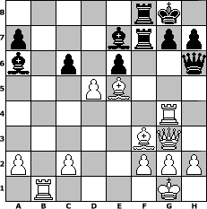 Partie-Notation im PGN-Format [Event "Clubmeisterschaft 2011"] [Site "www.mySchach.de"] [Date "2011.03.05"] [Round "2"] [White "Svetlana"] [Black "kischok69"] [ECO "B20"] [WhitemyELO "1654"] [BlackmyELO "1750"] [Result "1-0"] [TimeControl "10/1728000"] [WhiteDays "42"] [BlackDays "00"] [MySchachNr "72567"] 1. e4 c5 2. d4 e6 3. Nf3 cxd4 4. Nxd4 Nf6 5. Nc3 Bb4 6. e5 Nd5 7. Bd2 Nxc3 8. bxc3 Ba5 9. Qg4 O-O 10. Qg3 f6 11. Bf4 Rf7 12. Rd1 Nc6 13. Nxc6 bxc6 14. exf6 Qxf6 15. Be5 Qh6 16. Be2 d5 17. O-O Bb6 18. Rb1 Bd7 19. Rb4 Raf8 20. Bf3 Bc5 21. Rh4 Qd2 22. Rg4 Qh6 23. Rd1 Be7 24. Rb1 Bc8 25. c4 Ba6 26. cxd5 1-0 Stellungs-Notation im FEN-Format 5rk1/p3brpp/b1p1p2q/3PB3/6R1/5BQ1/P1P2PPP/1R4K1 - - - 0 26 Geschlagene Figuren Weiss: Geschlagene Figuren Schwarz: Klicken Sie auf eine geschlagene Figur um den gewünschten Zug darzustellen!