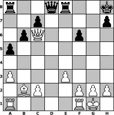Partie-Notation im PGN-Format [Event "wer hat lust"] [Site "www.mySchach.de"] [Date "2008.12.08"] [Round "1"] [White "Ostseeboy"] [Black "Knight"] [ECO "A00"] [WhitemyELO "1275"] [BlackmyELO "1121"] [Result "1-0"] [TimeControl "10/2592000"] [WhiteDays "90"] [BlackDays "88"] [MySchachNr "50565"] 1. b4 e5 2. Bb2 Bxb4 3. Bxe5 Nf6 4. Nf3 O-O 5. e3 Re8 6. Be2 d6 7. Bb2 Nc6 8. O-O Bg4 9. a3 Ba5 10. Nc3 d5 11. d4 Ne4 12. Nxe4 dxe4 13. Nd2 Bxe2 14. Qxe2 Bxd2 15. Qxd2 Ne5 16. Qb4 b6 17. dxe5 a5 18. Qxe4 f6 19. Qc4+ Kh8 20. exf6 gxf6 21. Qc6 1-0 Stellungs-Notation im FEN-Format r2qr2k/2p4p/1pQ2p2/p7/8/P3P3/1BP2PPP/R4RK1 - - - 1 21 Geschlagene Figuren Weiss: Geschlagene Figuren Schwarz: Klicken Sie auf eine geschlagene Figur um den gewünschten Zug darzustellen!