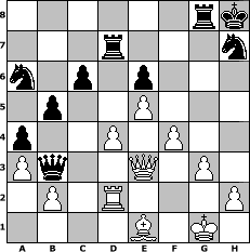 Partie-Notation im PGN-Format [Event "Turnier in den M"] [Site "www.mySchach.de"] [Date "2014.02.19"] [Round "1"] [White "Mattheus"] [Black "lotchi"] [ECO "A50"] [WhitemyELO "1218"] [BlackmyELO "1284"] [Result "0-1"] [TimeControl "10/2592000"] [WhiteDays "30"] [BlackDays "30"] [MySchachNr "93085"] 1. d4 Nf6 2. c4 d5 3. e3 Bg4 4. Nf3 Bxf3 5. Qxf3 e6 6. Nc3 c6 7. Bd3 Bb4 8. Bd2 Bxc3 9. Bxc3 dxc4 10. Bxc4 O-O 11. O-O b5 12. Bb3 a6 13. Rfe1 a5 14. a3 a4 15. Bac2 g6 16. e4 h5 17. Qg3 Na6 18. e5 Nh7 19. Bxg6 fxg6 20. Qxg6+ Kh8 21. Qxh5 Qe8 22. Qh3 Qf7 23. Re2 Qf5 24. Qe3 Ra7 25. g3 Raf7 26. f4 Rg8 27. Rg2 Rd7 28. Rd1 Qh5 29. Be1 Qxd1 30. Rd2 Qb3 0-1 Stellungs-Notation im FEN-Format 6rk/3r3n/n1p1p3/1p2P3/p2P1P2/Pq2Q1P1/1P1R3P/4B1K1 - - - 2 31 Geschlagene Figuren Weiss: Geschlagene Figuren Schwarz: Klicken Sie auf eine geschlagene Figur um den gewünschten Zug darzustellen!